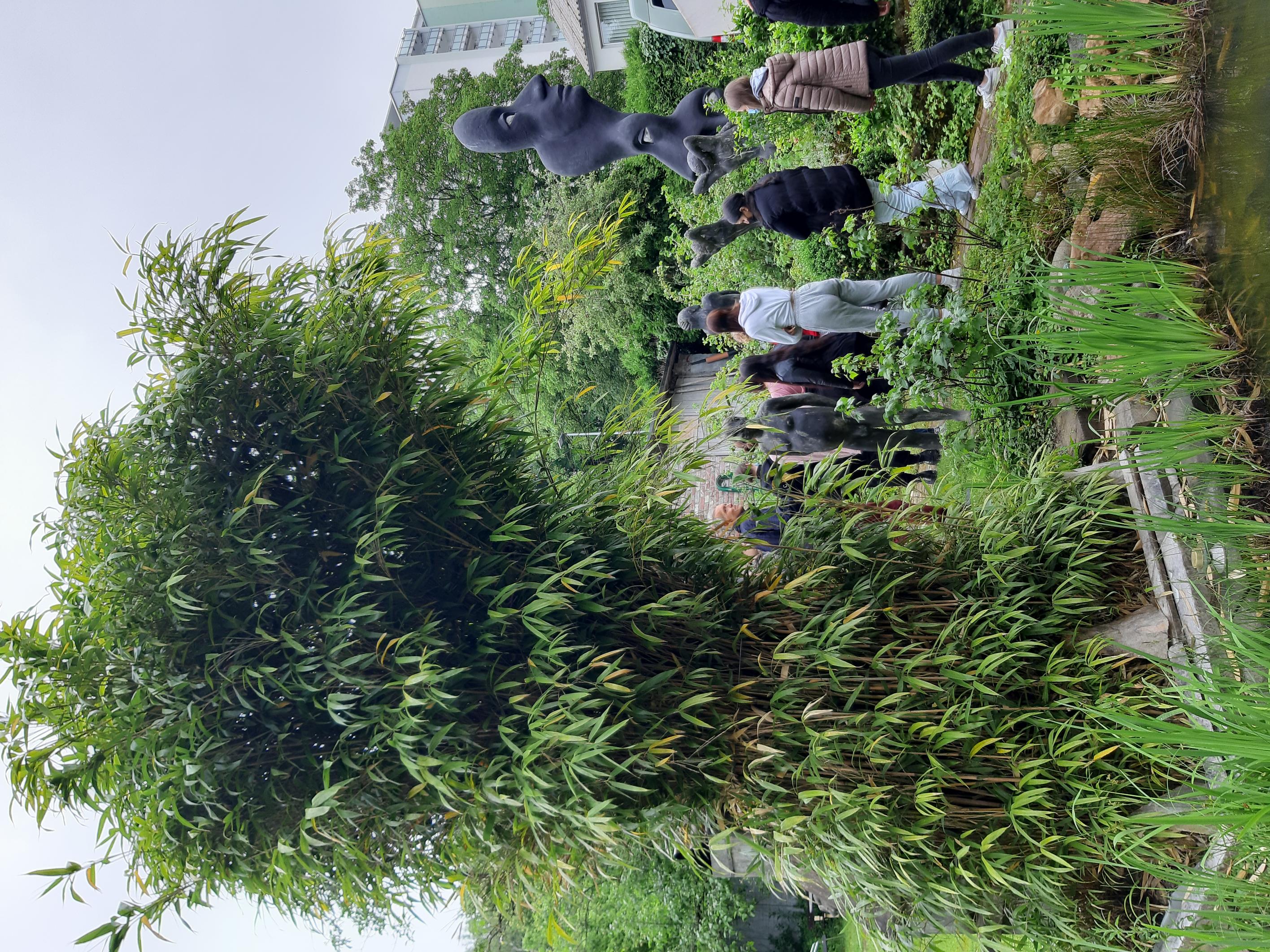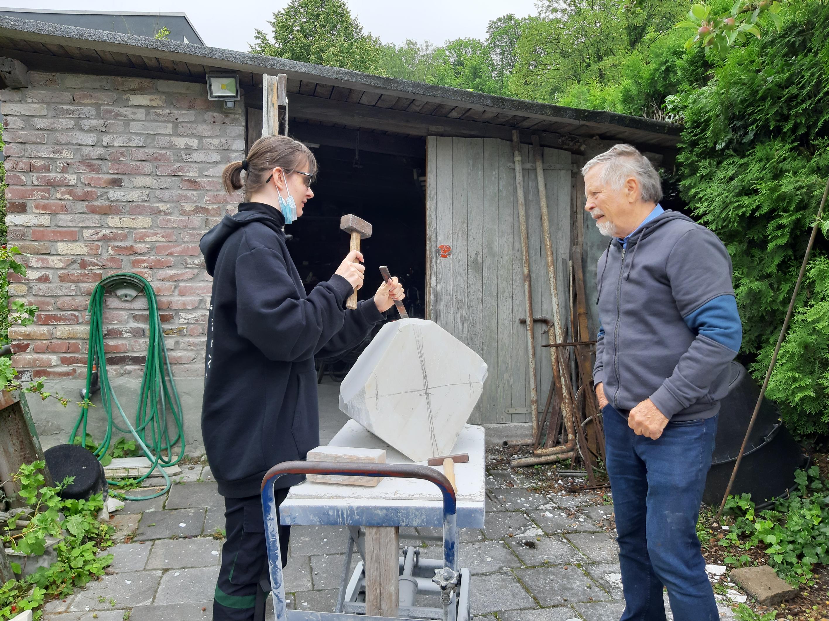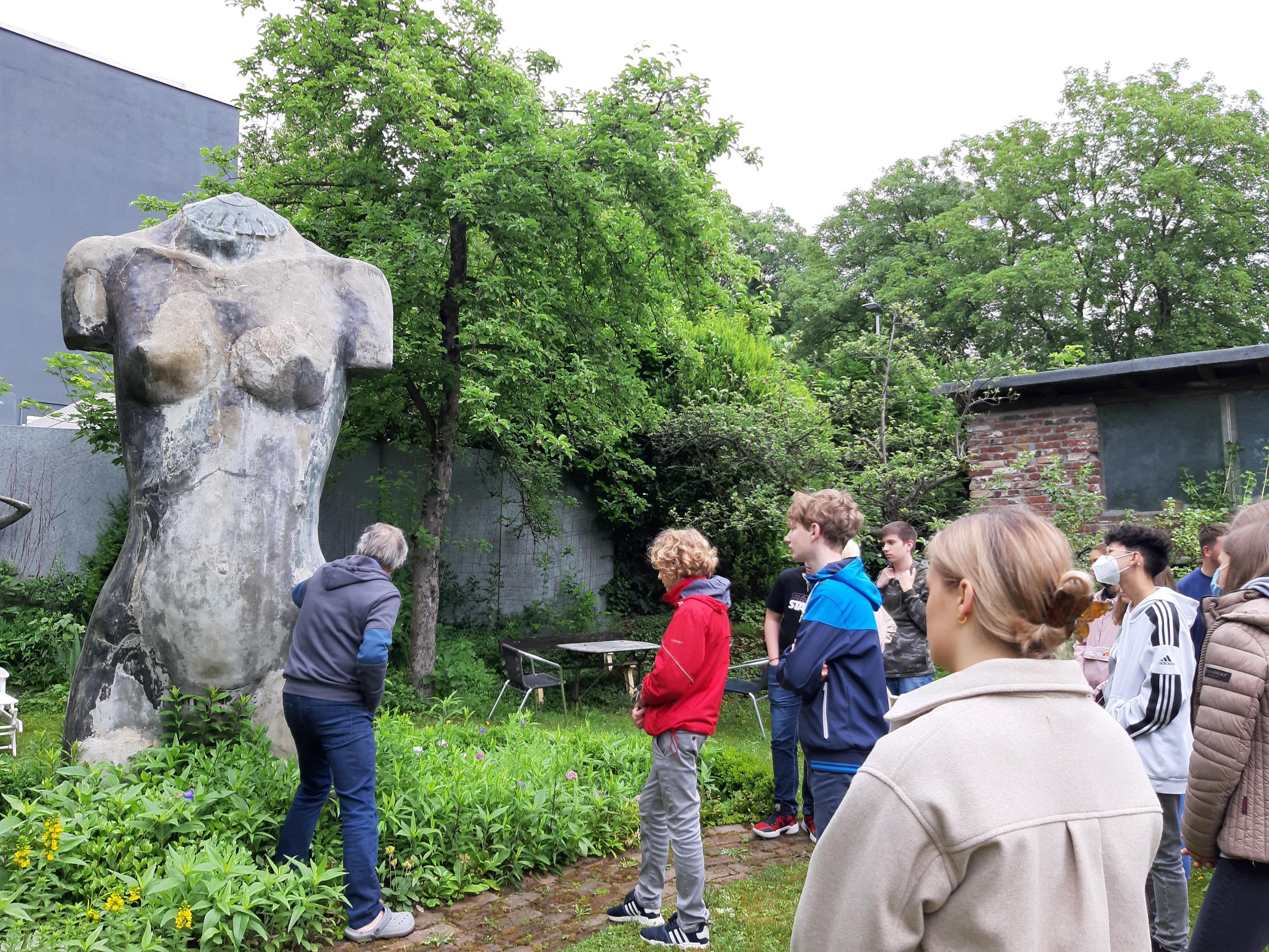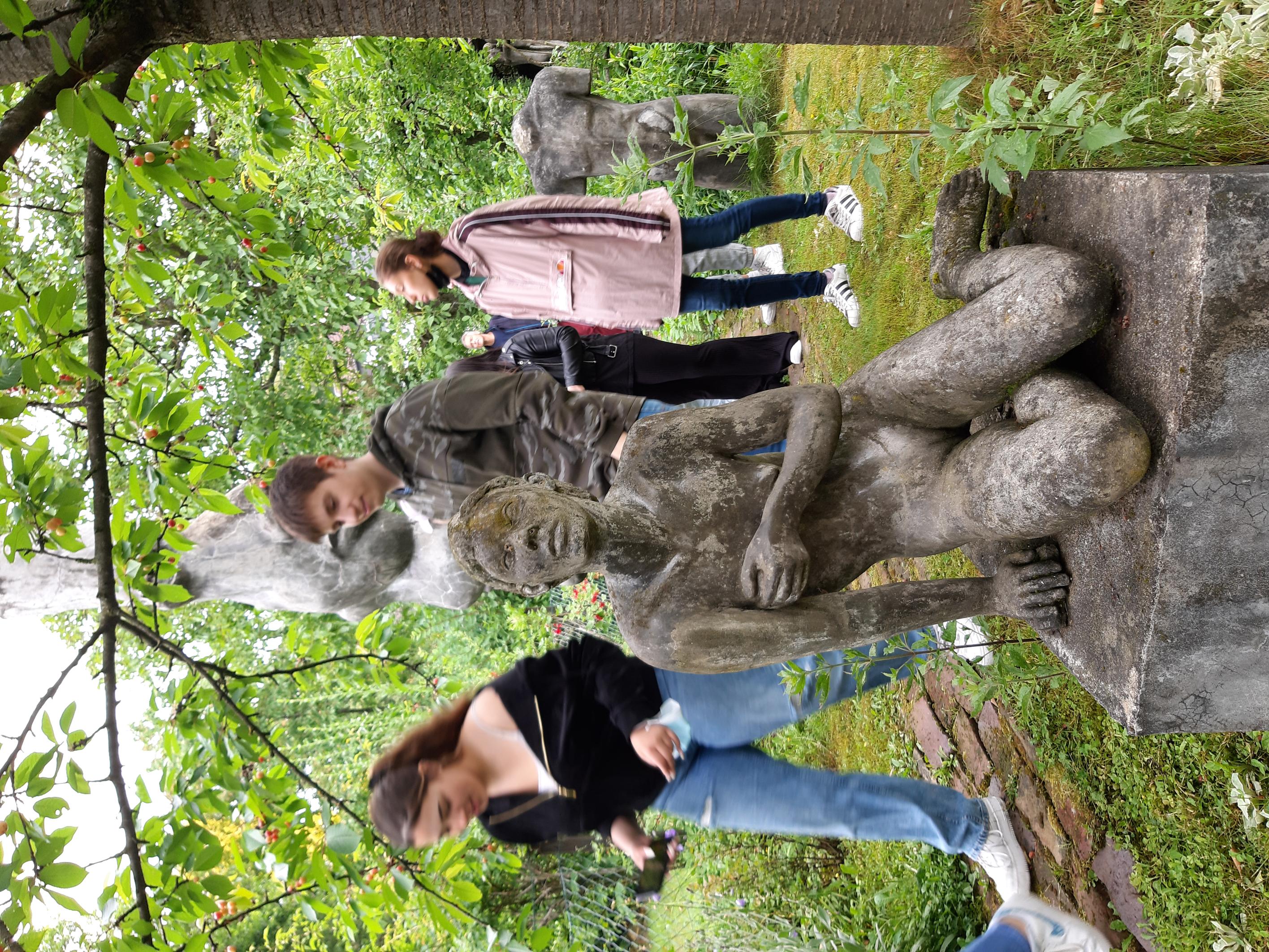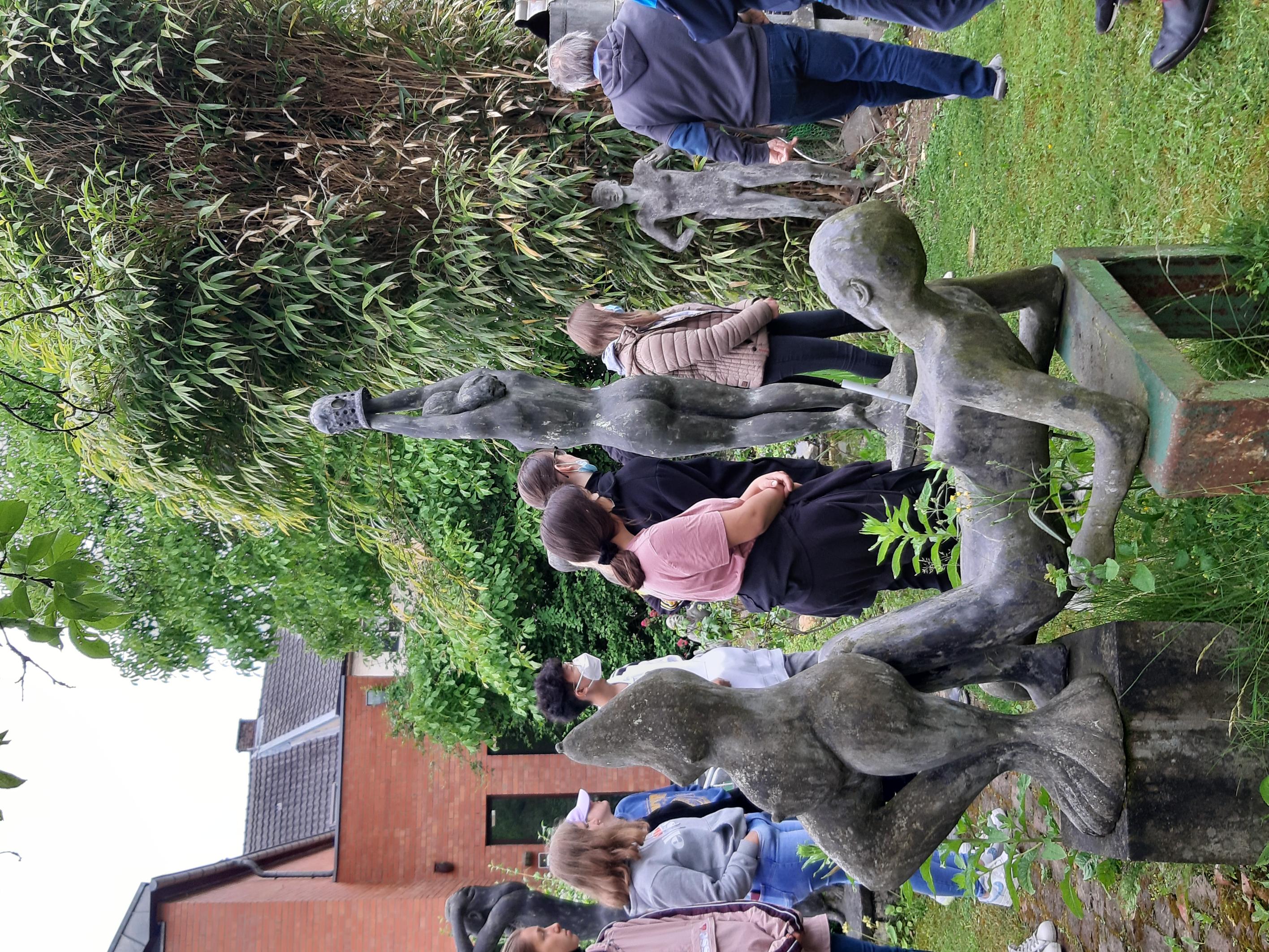 Seit 1975 arbeitet Eugen Ignatius an Plastiken in Lebensgröße bis hin zu monumentalen Skulpturen – mitten in Bergisch Gladbach. Als Material für seine Großfiguren verwendet er Beton und Marmor. Wie man eine Marmorskulptur unmittelbar aus dem Block schlagen kann, erlebten die KunsthauptfachschülerInnen der Stufe 9 hautnah. Der Künstler lud sie in seinen Skulpturengarten ein, erklärte Vorgehensweise und Motive und ließ sie später selbständig auf Entdeckungsreise gehen.
