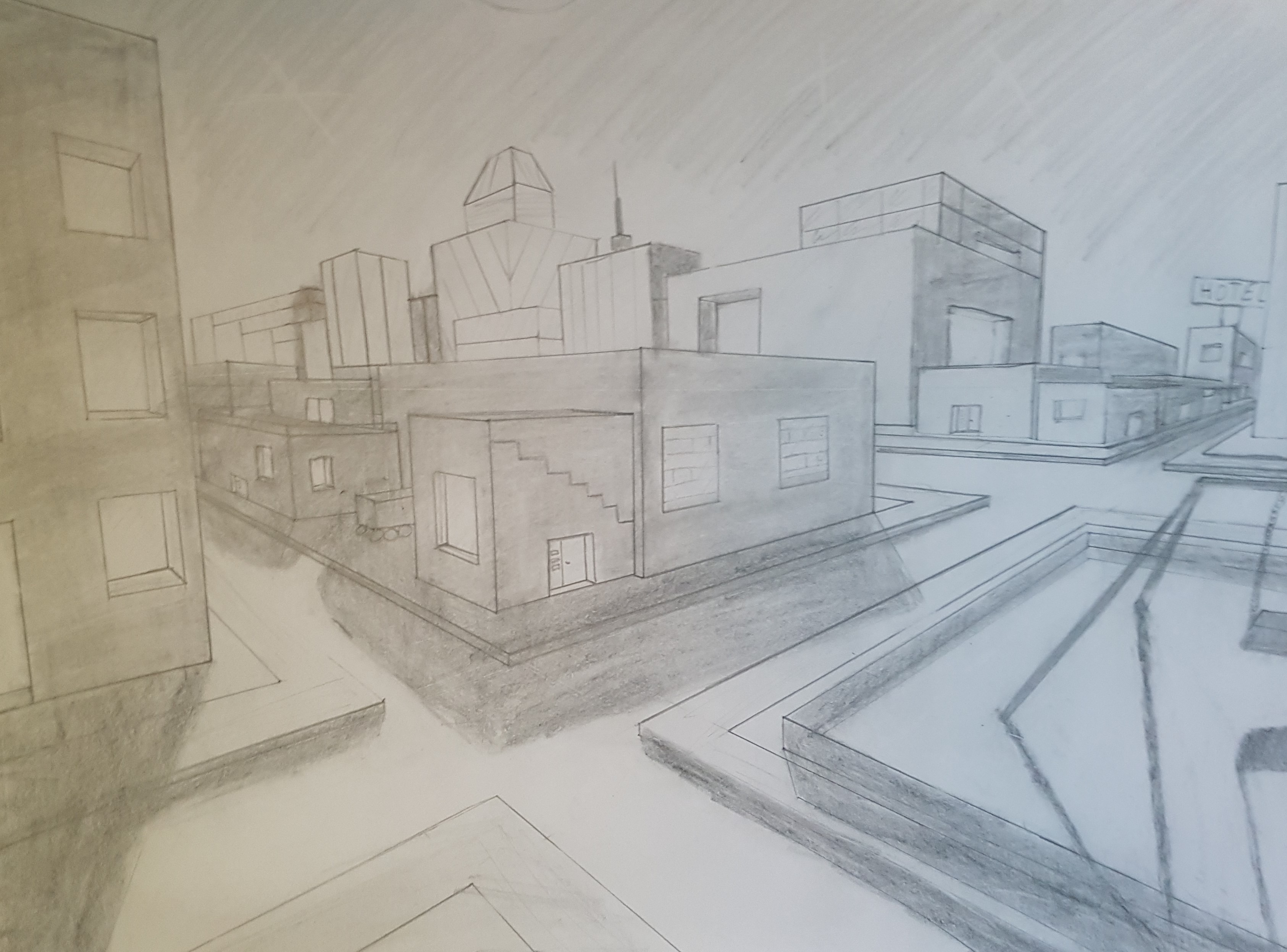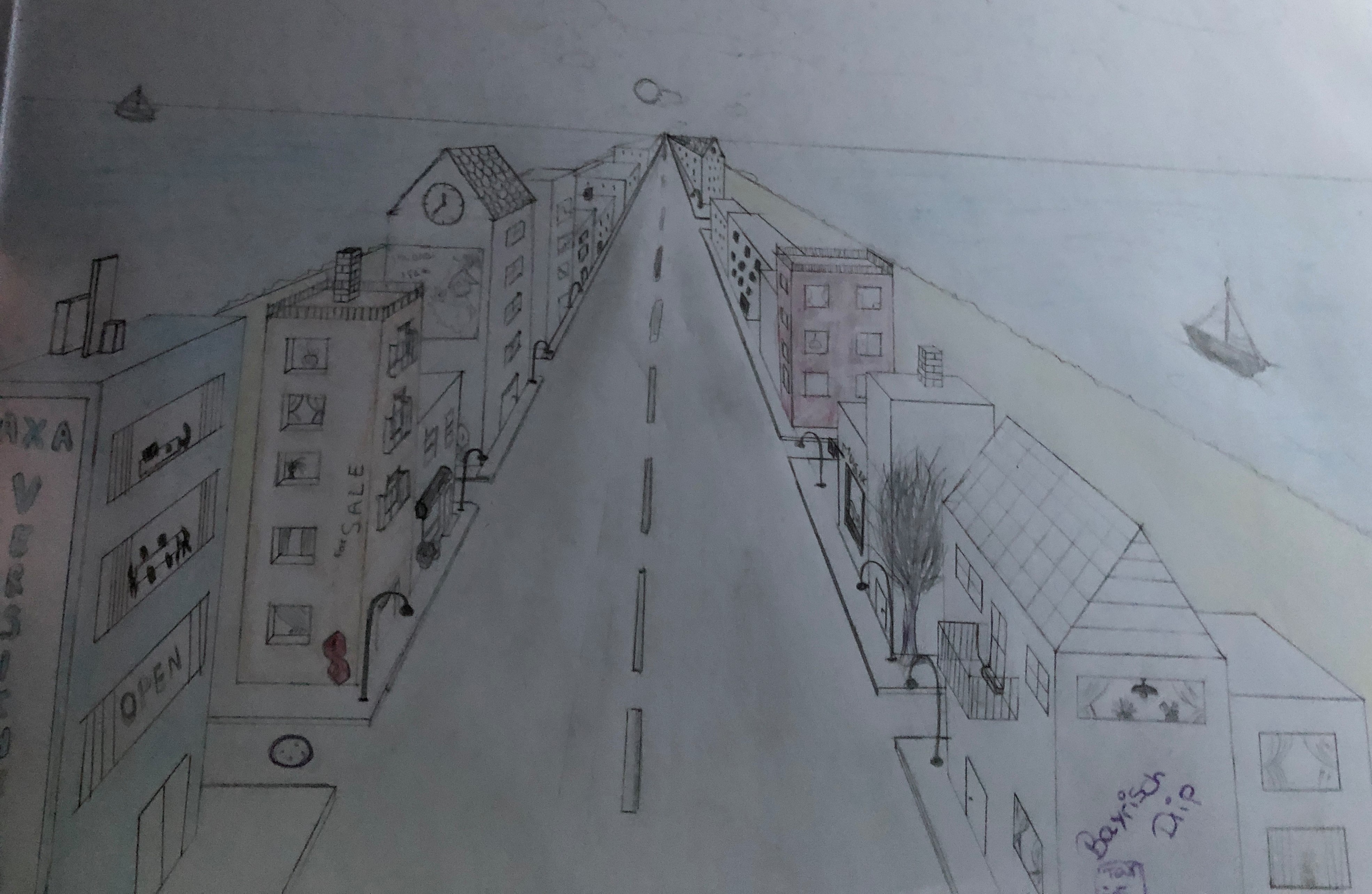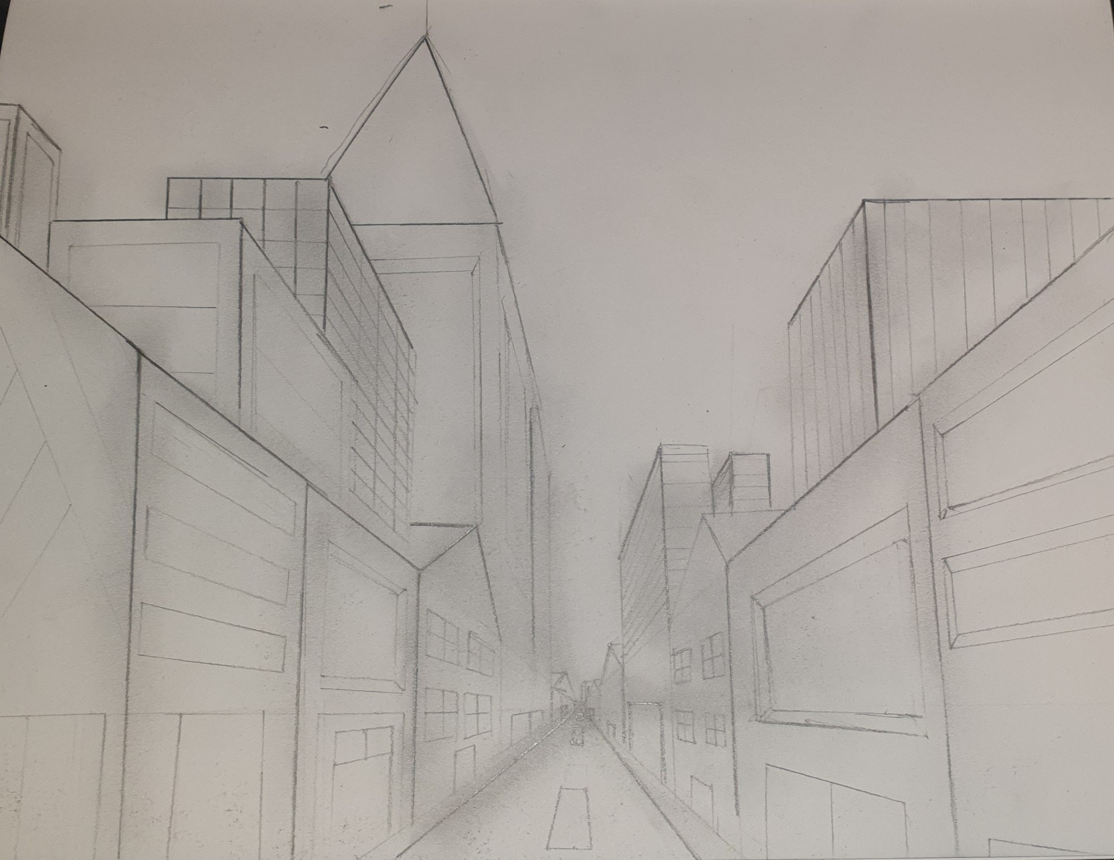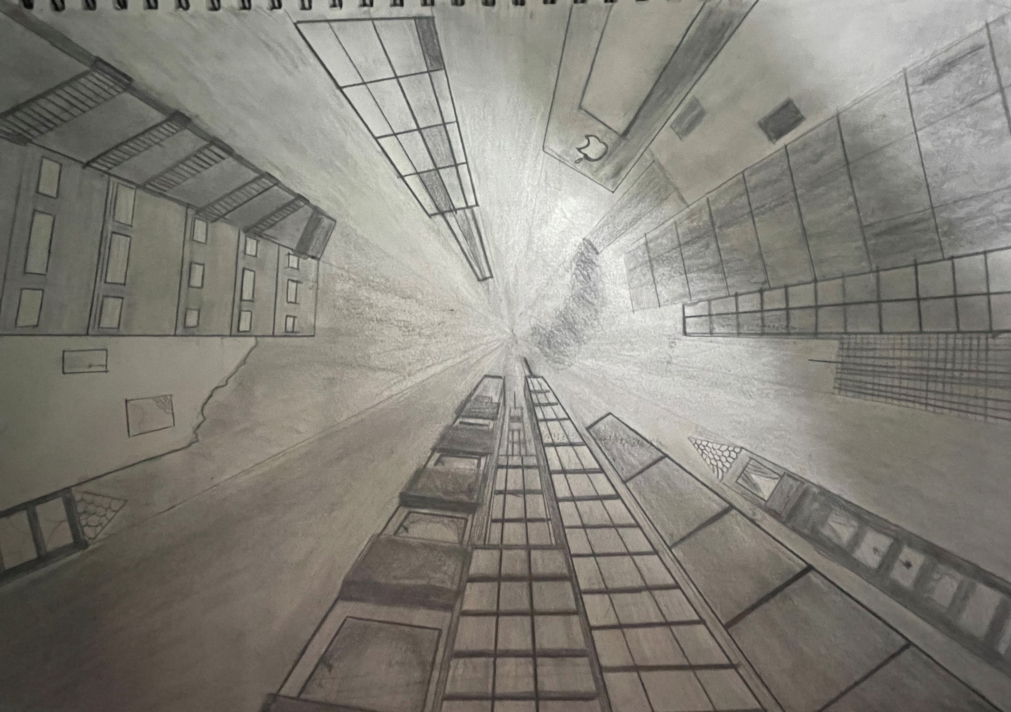 Die SchülerInnen des Hauptfachkurses der Klassen 9 beschäftigten sich über einen längeren Zeitraum im Präsenzunterricht und auch im Distanzunterricht mit dem Thema Perspektive. Zentralperspektive, Zwei-Fluchtpunktperspektive, Parallelperspektive, Frosch- und Vogelperspektive wurden besprochen, Unterschiede erläutert und die praktische Umsetzung erprobt.