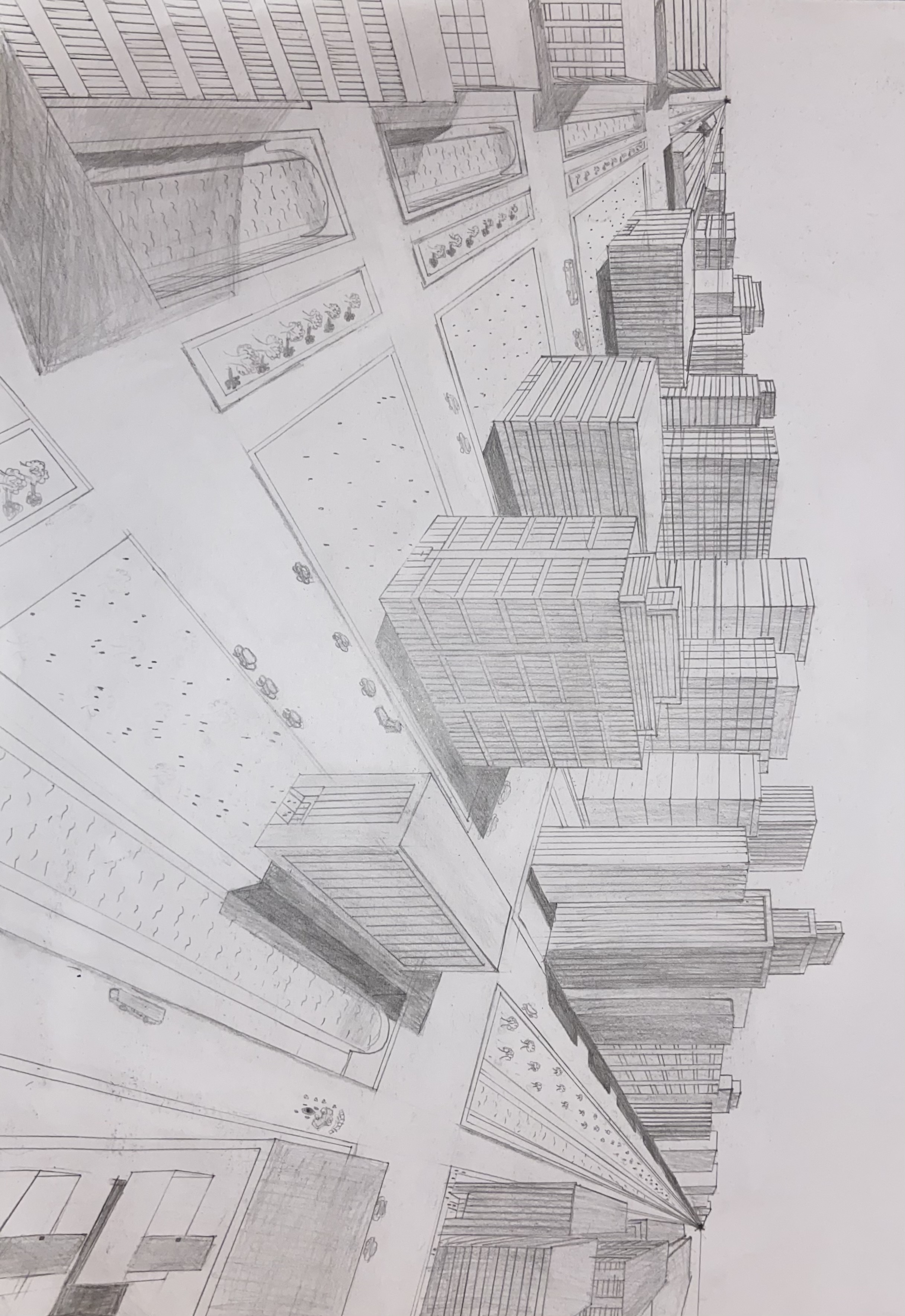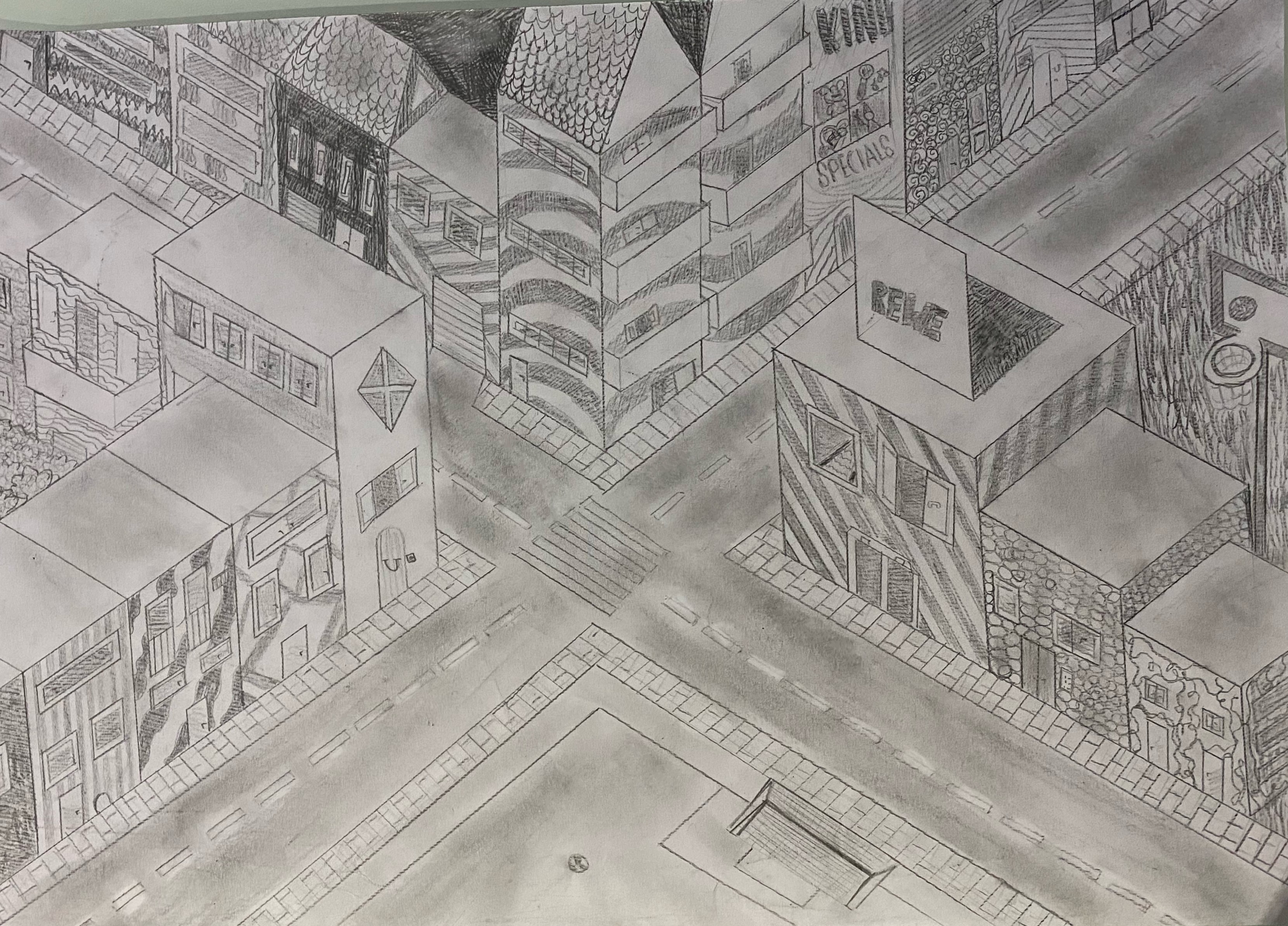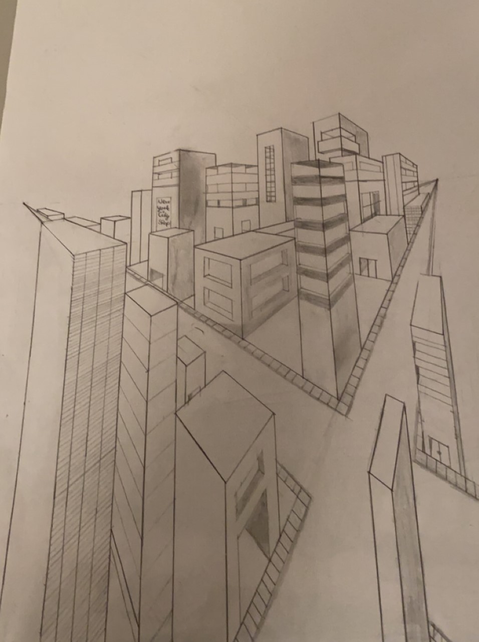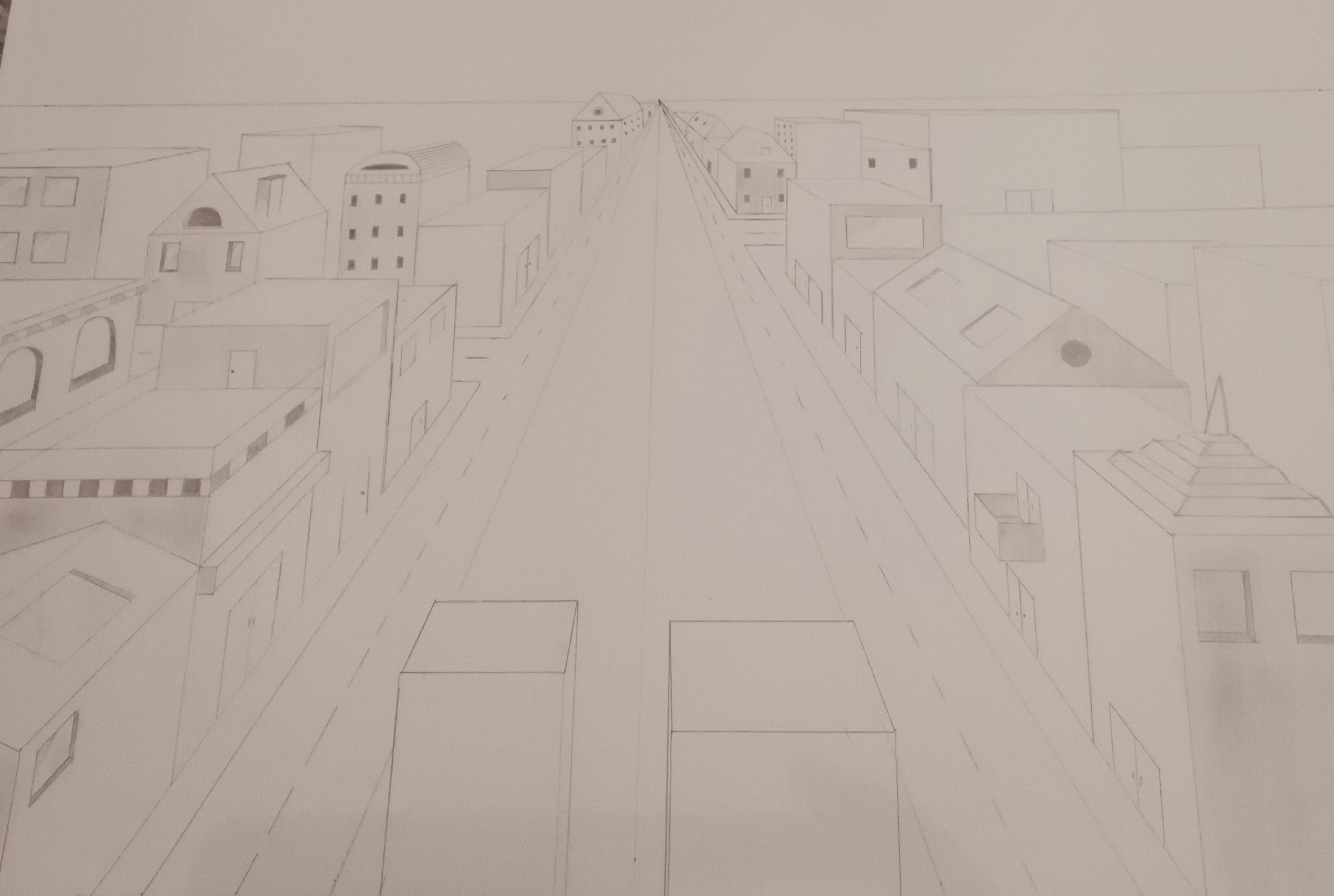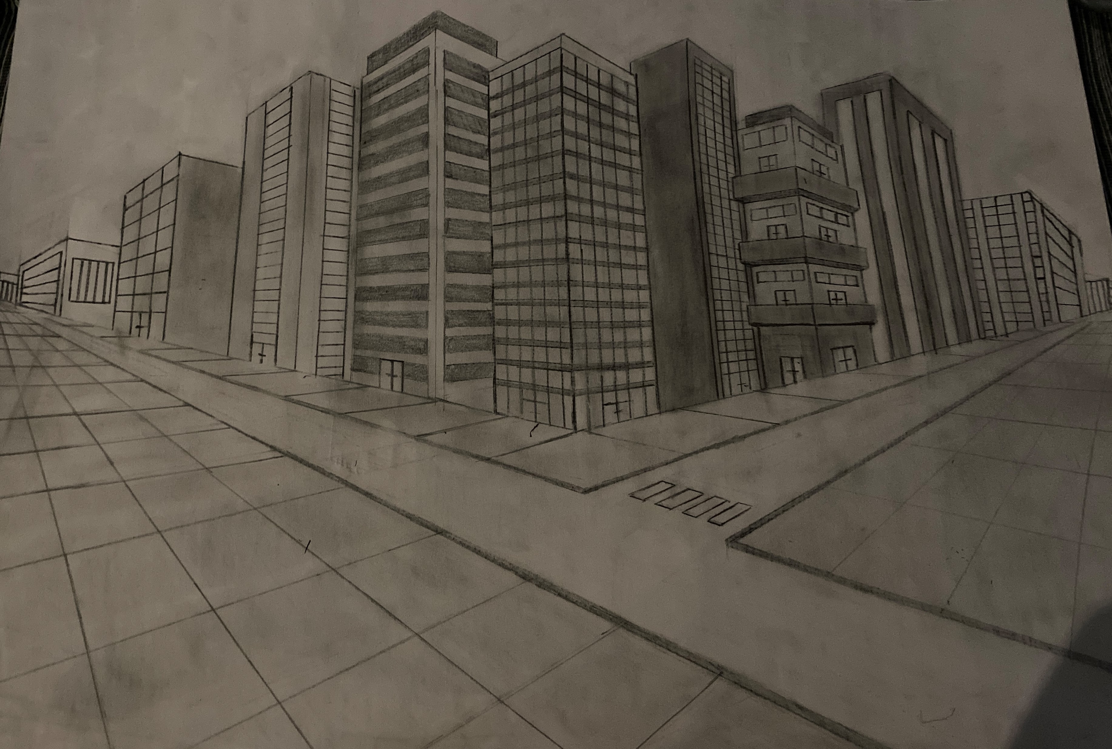 Die SchülerInnen des Hauptfachkurses der Klassen 9 beschäftigten sich über einen längeren Zeitraum im Präsenzunterricht und auch im Distanzunterricht mit dem Thema Perspektive. Zentralperspektive, Zwei-Fluchtpunktperspektive, Parallelperspektive, Frosch- und Vogelperspektive wurden besprochen, Unterschiede erläutert und die praktische Umsetzung erprobt.