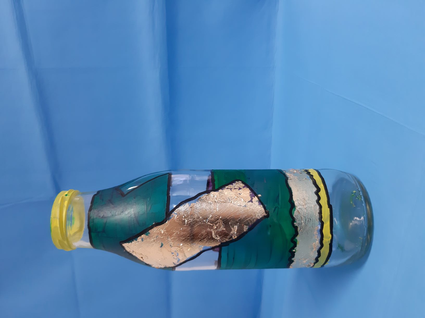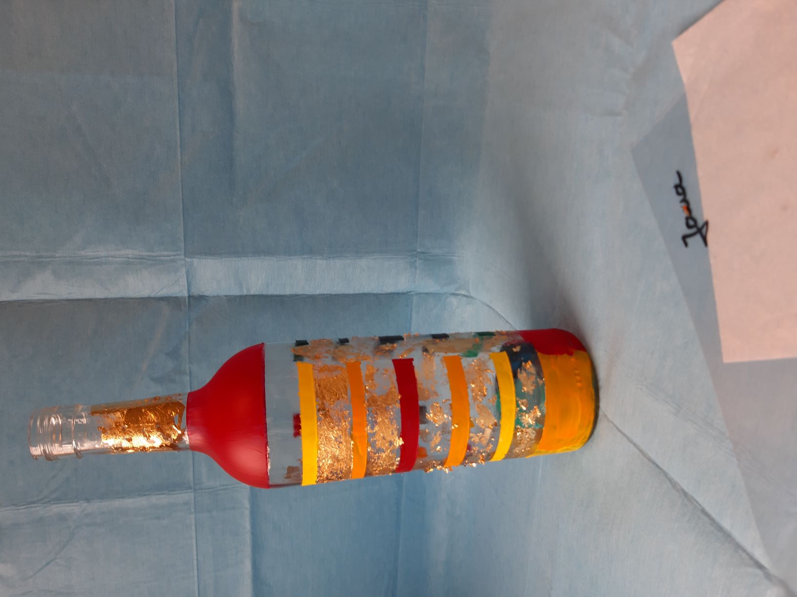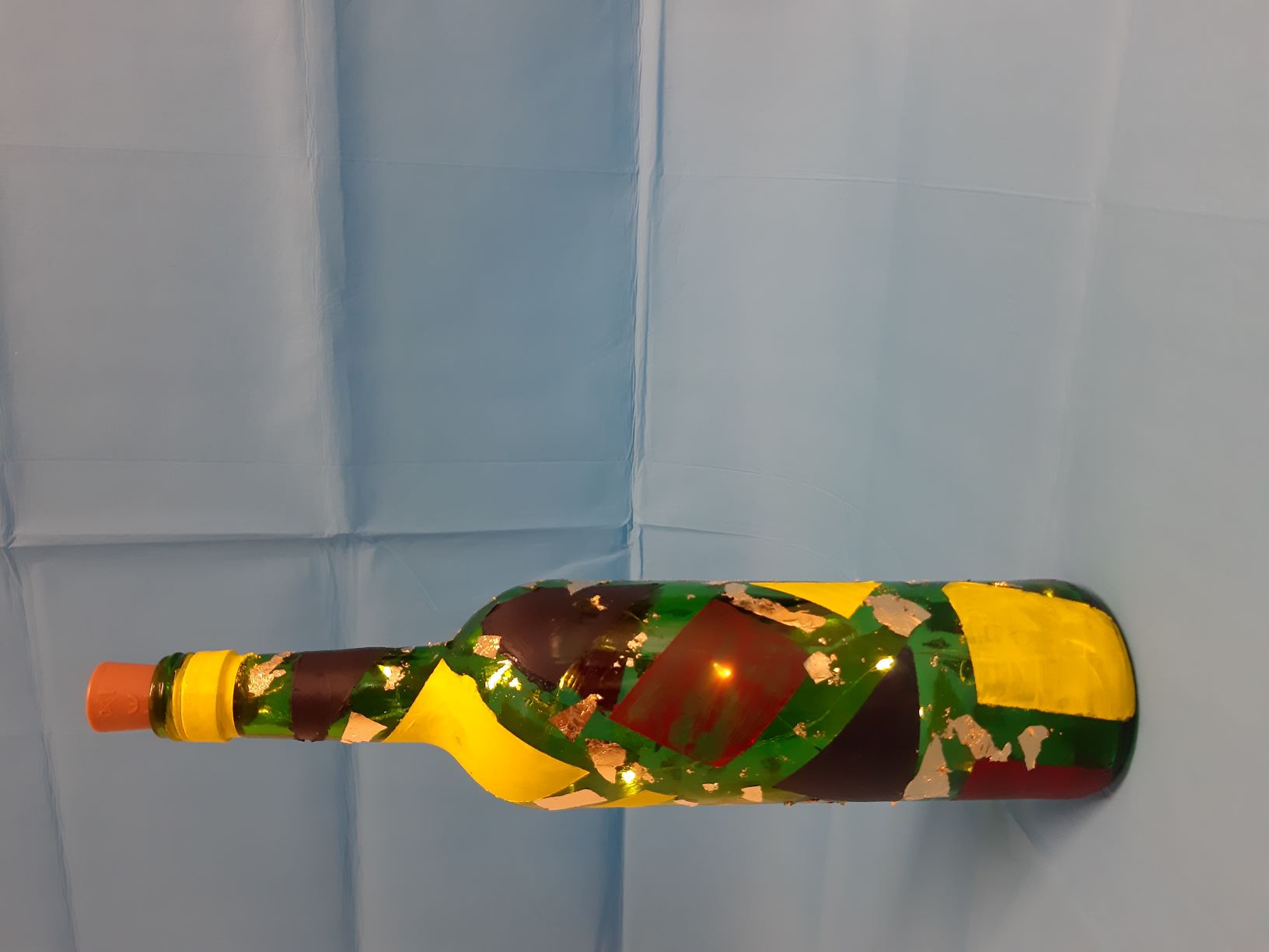 Im Unterricht befassten sich die SchülerInnen des Kunsthauptfachkurses 7KU3 mit Leben, Werk und Technik und dem politischen und gesellschaftskritischen Gedankengut des österreichischen Allroundkünstlers Friedensreich Hundertwasser. Mit ihren Deko-Flaschen griffen sie Hundertwassers Farbpalette auf, beeinflusst durch seinen prägnanten Stil. Sie erlernten den Umgang mit Blattgold.