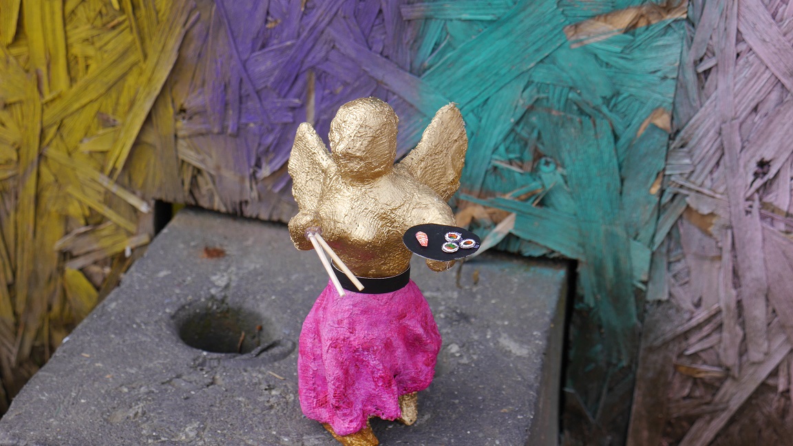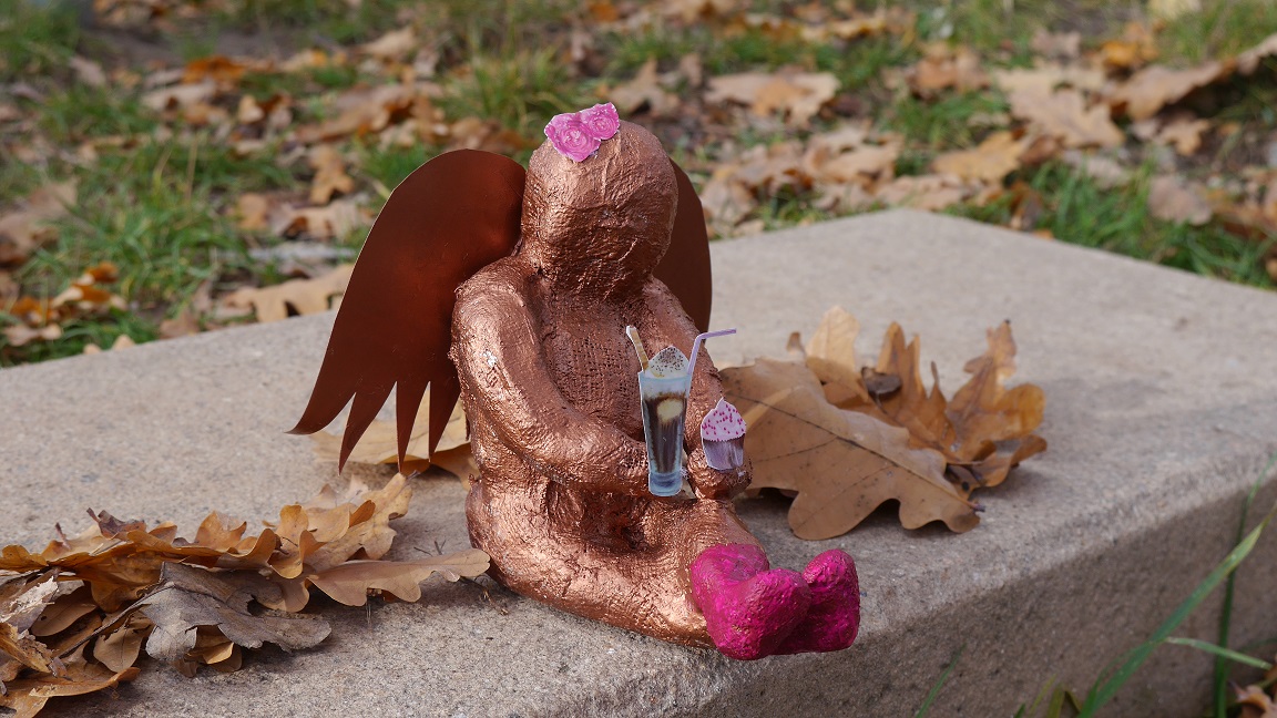 Es entstanden ballspielende Engel, Engel mit Handy und Kopfhörer und an der Konsole, Engel mit Sushi Tablett, Muffin und Milchshake. Ein Engel wurde zu Superman, ein anderer zum Zombie, betreibt Judo oder schwimmt, sprayt vermummt, blättert in einem Journal, ist Super Mario und mehr.