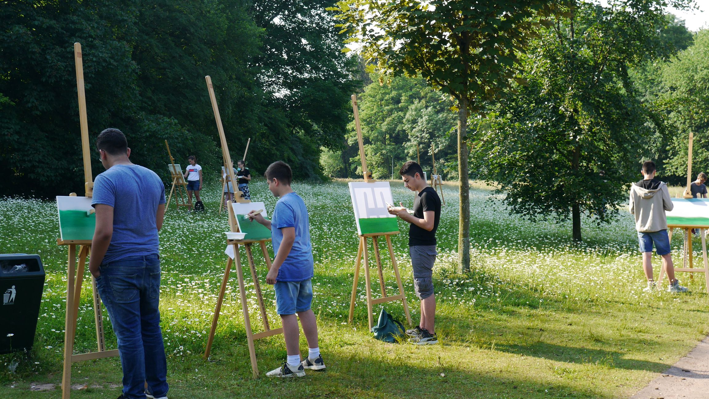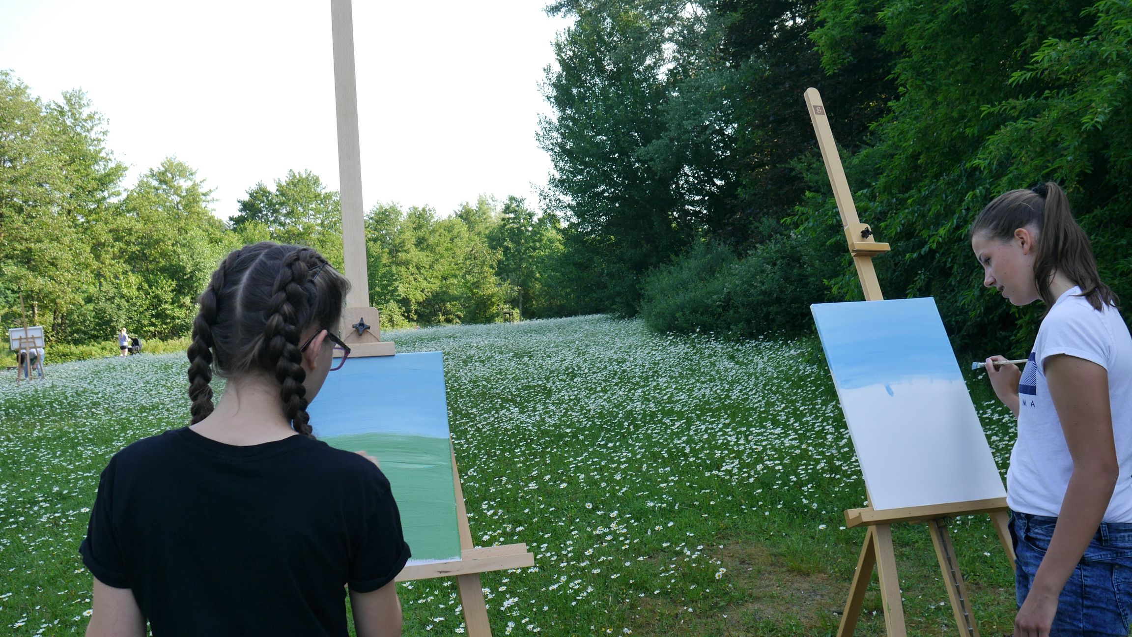Bei hochsommerlichen Temperaturen konnten die Schülerinnen und Schüler des Hauptfachkurses 8KU3 unter der Leitung von Frau Theuner Erfahrungen in Freilichtmalerei sammeln, indem sie „mit schwerem Gepäck“ auf das Gelände rund um die Saaler Mühle zogen und gleichsam in die Fußstapfen ihrer berühmten Vorbilder aus Frankreich traten. In nur 4 Unterrichtsstunden entstanden beeindruckende Landschaftsimpressionen.